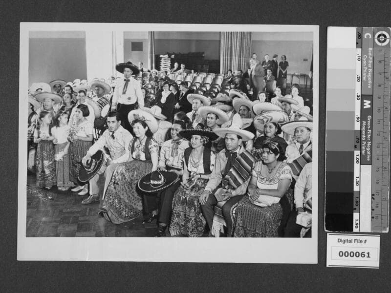 Black and white photograph of Harry Chandler at Olvera Street in downtown Los Angeles. Mr. Chandler greets a woman in festival attire as others look on. Information on verso indicates that the celebration is for Chandler's birthday in 1941. Paul Bertness Collection.