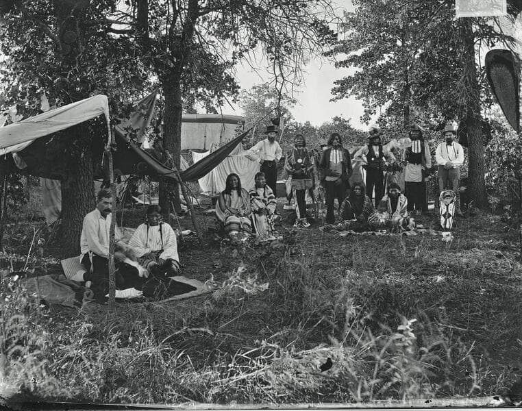 Temporary Cheyenne camp during Grand Council meeting, 1875. At left, interpreter Philip McClusker and his Cheyenne Indian wife, Minnehaha