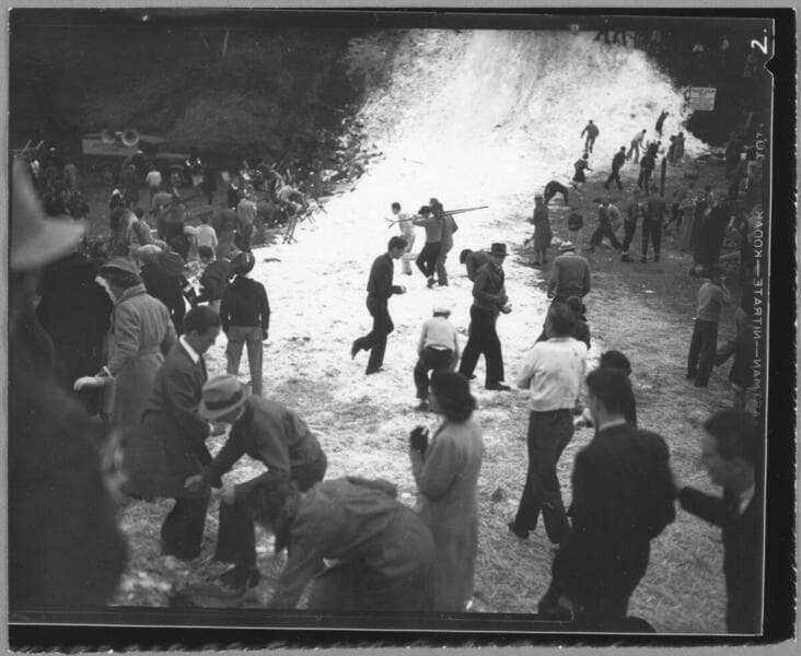 A crowd of people sit and stand on the hillside watching the ski jump at the Hollywood Bowl in Los Angeles. The are arranged around the finishing area, where the snow ends and is replaced by straw or hay.