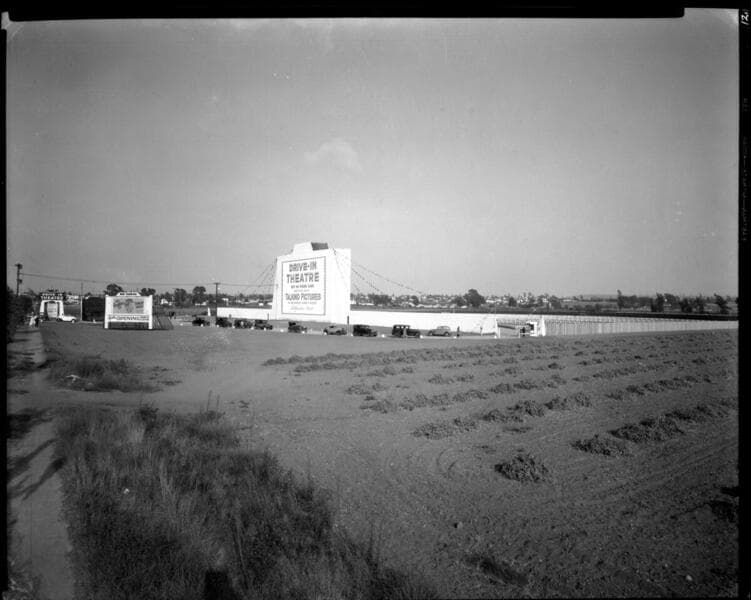 Image of a drive-in movie theater in Los Angeles, California, with a woman standing on the corner at the intersection of West Pico Boulevard and Westwood Boulevard. The writing on the drive-in signs read "Drive-in theatre sit in your car see and hear talking pictures on the world's largest screen - California's first" "turn all lights out here" and "drive-in theater admission prices adults $.35 per person."