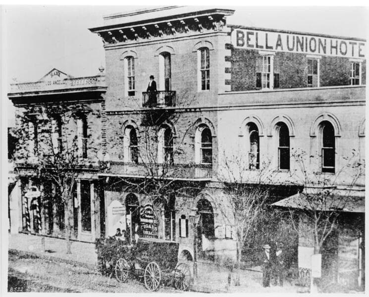 Bella Union Hotel and Bank of Los Angeles (now Farmers and Merchants) approximately 1871