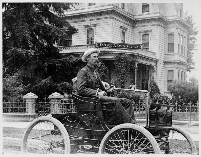 A view of a stage coach with 4 horses with passengers in front of the Pico House. The side of the stage coach has lettering saying "Pasadena", "Los Angeles" and "Sierra Madre (?) Villa".