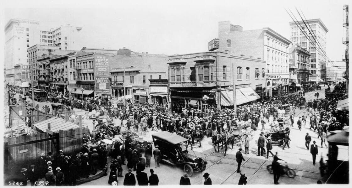 Spring Street and Fifth Streets looking West. Security Bank Building, built in 1906