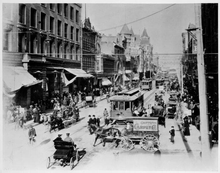 A view of Spring Street on the opening day of Cable Road. The street is filled with pedestrians, carriages and trolleys.