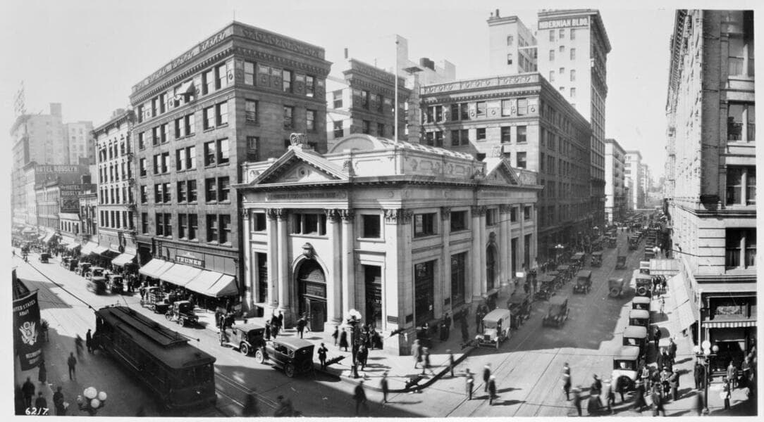 Two blocks of Commercial Street from Main Street to Los Angeles Street to San Pedro Street. Security First National Bank branch, 302 North Main Street, is at left.