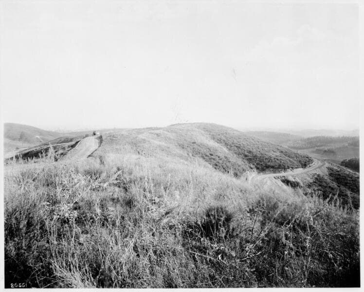 A view looking from Elysian Park towards the San Gabriel Mountains with farmlands, farmhouses and the Los Angeles River.