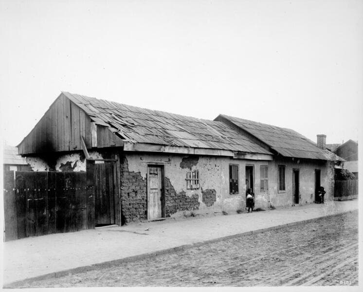 View of an adobe building at 714 Castelar Street in the Plaza section of Los Angeles (also called Sonora Town) on a dirt road, with a woman standing in the doorway and children are in the road, nearby.