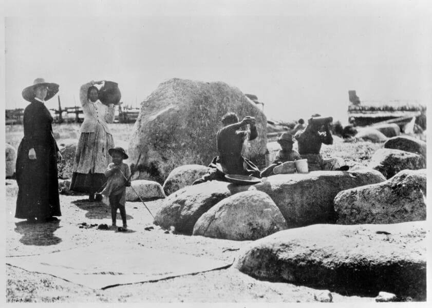 A view of an old Indian woman seated with a rock between her legs. On the rock is a basket and she is grinding acorns into flour with a grinding stone.