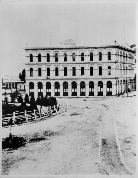 A view of a stage coach with 4 horses with passengers in front of the Pico House. The side of the stage coach has lettering saying "Pasadena", "Los Angeles" and "Sierra Madre (?) Villa".