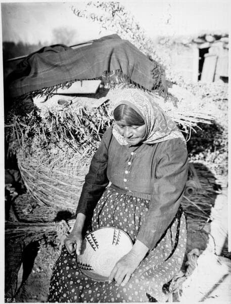 A view of a seated Pala Indian woman finishing a basket. Behind there is a brush fence.