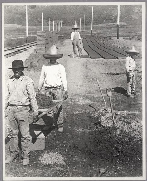 A view of an Chemehuevi woman making the splints for weaving baskets. She has two baskets; one on either side of her and two bunches of reeds ready to weave.