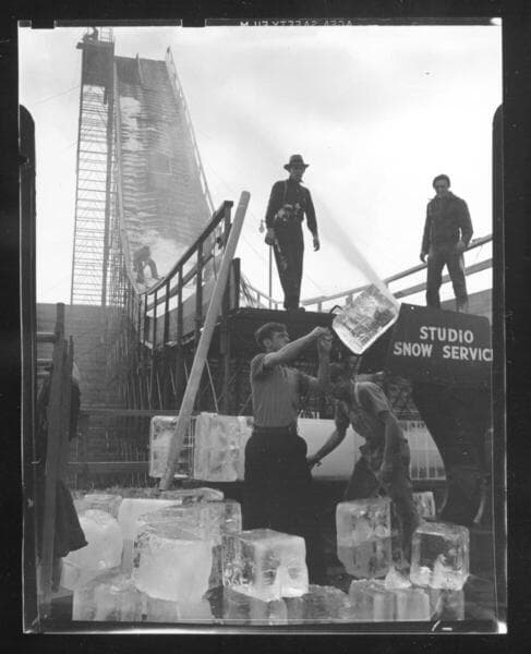 A view of a ski jump constructed in the Los Angeles Memorial Coliseum from ground level, facing up the slope. The jump is only partially covered with snow, which is being shot out of machines onto the wooden boards of the jump. Men at the bottom of the jump are laying more boards and covering them with hay or straw.