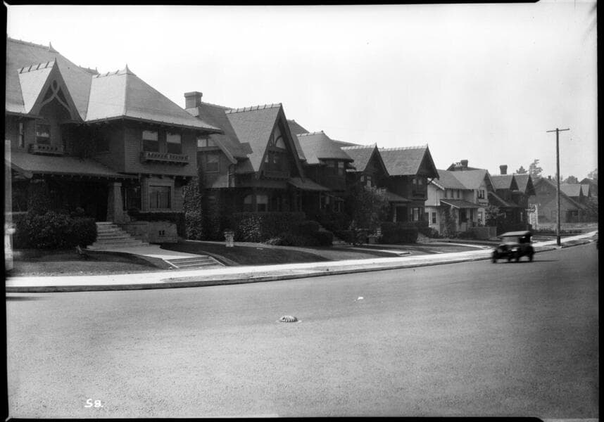 A street view of a large white house, identified as the Hancock Mansion, on Wilshire in Los Angeles. There are several automobiles parked along the street and a few others in motion.