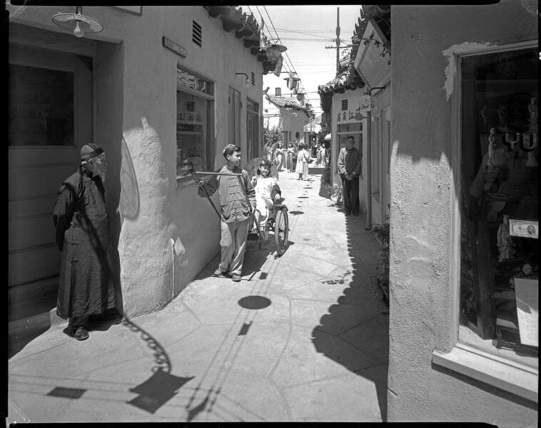 A group of 16 photographic postcards of the commercial areas of Los Angeles New Chinatown and China City, taken between approximately 1938 and 1940, shortly after they were built. The postcards were made for commercial sale and most have white lettered titles across the bottom of the photographs. The images focus on Chinese-style architecture featuring a large pagoda, gateway structures, a statue, restaurants, and shops with neon lighting. Several are credited to photographer Harry Quillen.