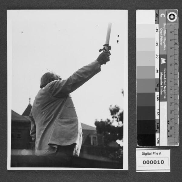 Black and white photograph of Harrison Gray Otis in white suit, three-quarter length and side view, with right arm raised holding a scroll, speaking at unidentified location. Lower half of his face is obscured. Partial view of tree and structure in background. Related to Image Number 000010 - larger view.