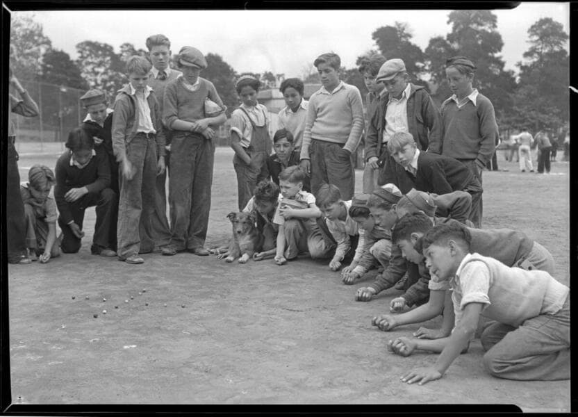 A group of children film their own Western movie in View Park in Los Angeles. In front of the camera there are two boys dressed in cowboy outfits and a girl holding a baby doll. One of the cowboys stands with his foot resting on the prone body of the other boy, and his arm around the girl. A boy dressed in knickerbockers and a sweater works a camera on a tripod, while a similarly dressed boy watches from the side.