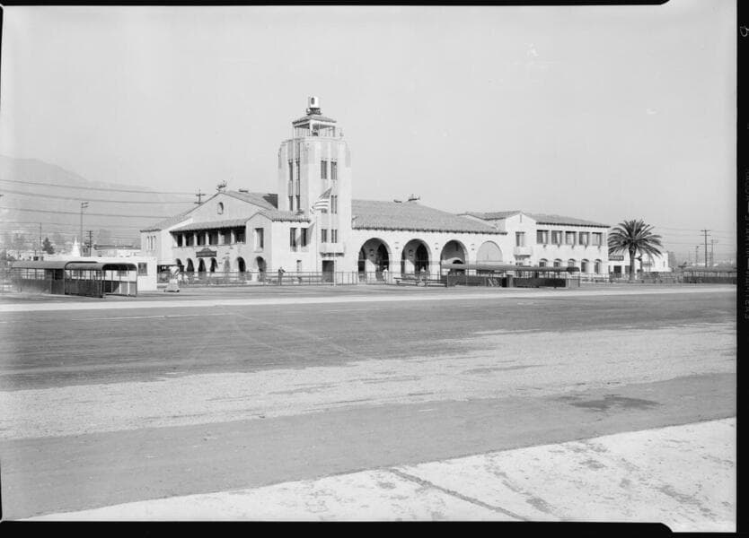 Image of the Grand Central Air Terminal building in Glendale, California, with writing on the building (obscured) for the Curtiss-Wright Technical Institute. With a large palm tree, individuals looking out towards the air field, and the air traffic control tower visible.