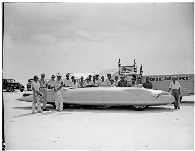 John Cobb comes to a stop in his Railton automobile at the Bonneville Salt Flats in Utah. Men wearing AAA armbands escort the vehicle into an area marked "Gilmore record breaker lane". The vehicle has the Gilmore Oil Company lion logo painted on the front. A crowd of people are kept away from the automobile by wire fences.