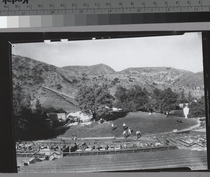 A view of the stands of the Hollywood Bowl during construction. The seating area is roughly circular and is built into the side of a hill. The photograph was taken along a raised wooden walkway that leads to the stage area.