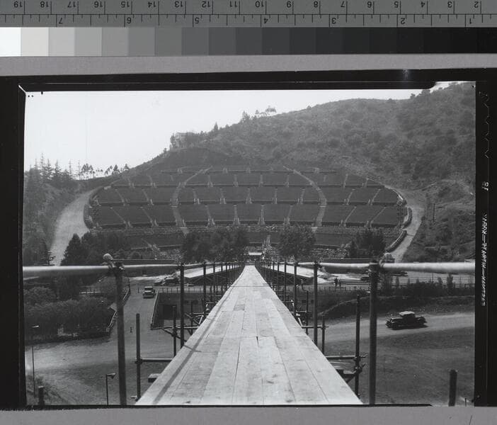 A view from the stands of the Hollywood Bowl during construction. A few men are working on the central stage area, which has a long raised walkway to the hill behind it.