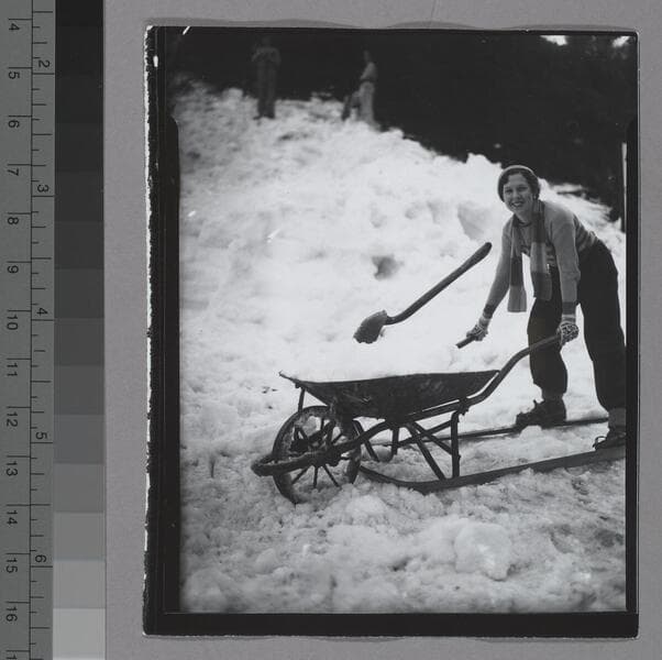 A woman with a shovel loads snow into a snow blower (?) at the bottom of a ski jump being constructed at the Hollywood Bowl in Los Angeles. The woman is wearing a hat, gloves, and a scarf, and stands in front of a thinly covered hill.
