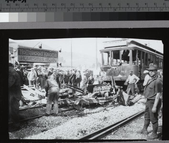 Traffic collision between street car and truck, Cahuenga Pass and Dark Canyon. 1924