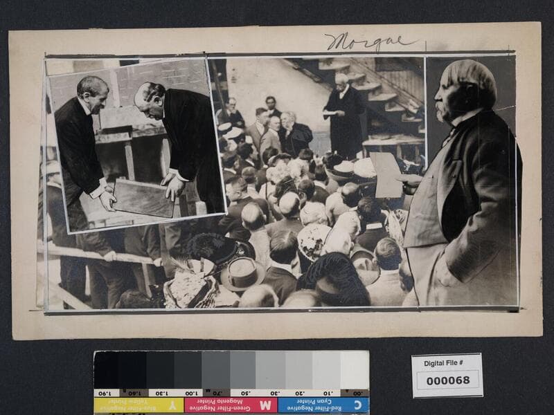 Black and white photograph of a group of men on a tour of the Los Angeles Times plant standing in front of portrait of Harrison Gray Otis. Portrait appears to be Image Number 000003. Photo has been marked up and cropped for publication, bottom center is torn. Bottom third of photo is scratched, with "X" on face of man to left and on shirt of man on right.