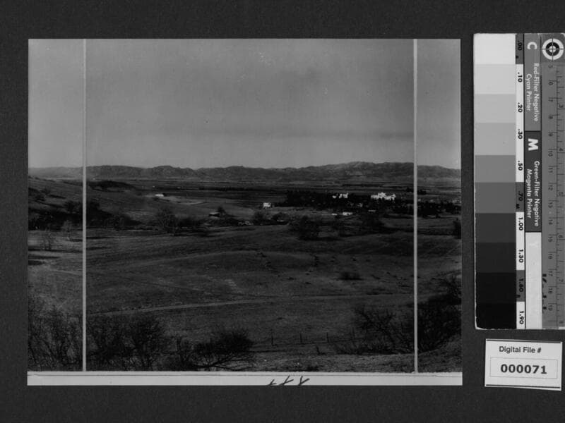 Black and white photograph of view of the landscape near Milflores, Harrison Gray Otis' Spanish-style home in the San Fernando Valley. Center of photo shows hills in background. Orchard, barn and corral visible in foreground, near left center of photo. Thick row of trees to right of photo. Bushes and shrubs present in lower right corner. Gray line running down the length of photo to left of print.
