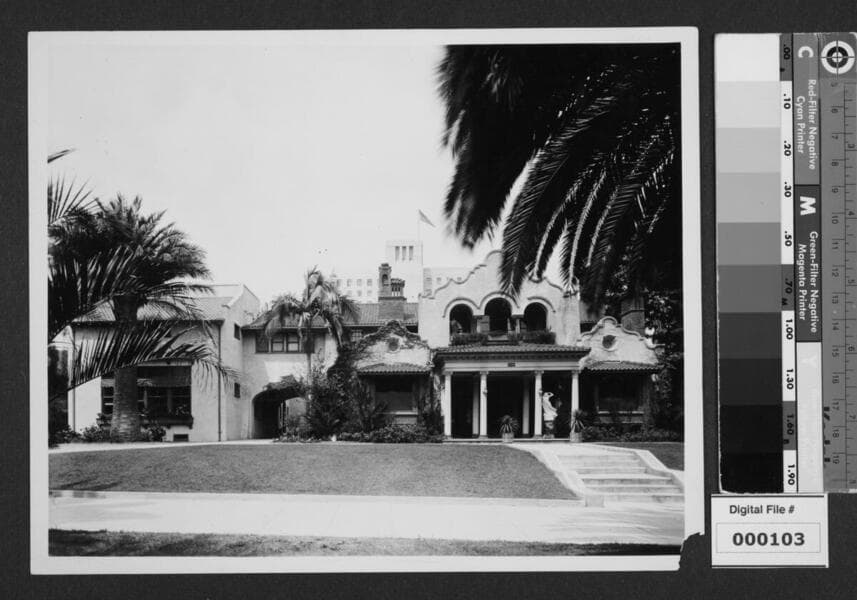Black and white photograph of the side entrance to The Bivouac, former residence of Harrison Gray Otis. Chimney visible at top right of photo. Large palm tree to right and left of photo. Plants and shrubs line bottom of palms, next to walkway. Doorway visible near center, with vines entwined around building.