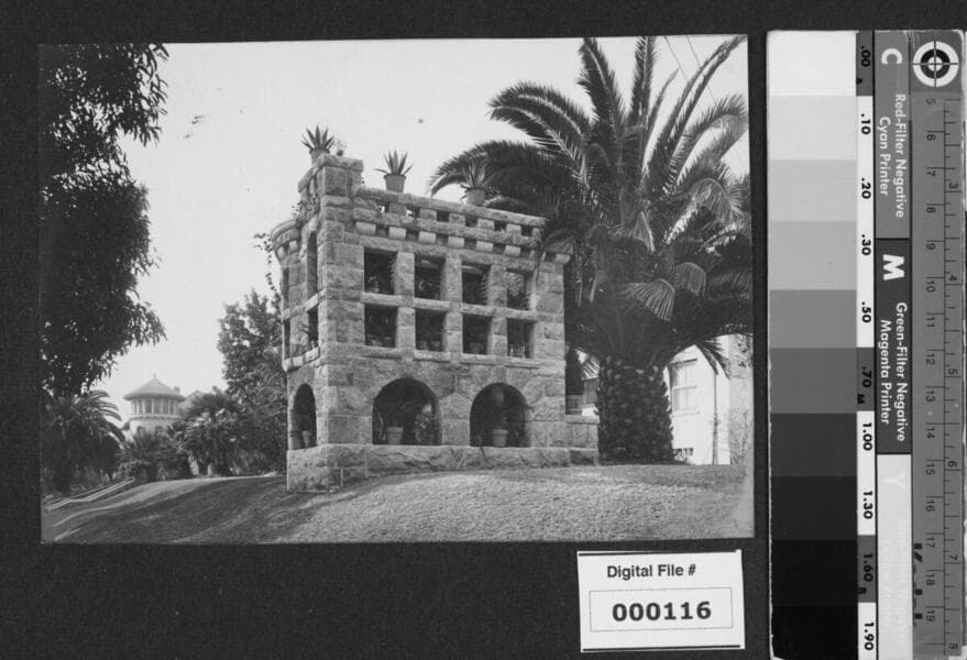 Black and white photograph of the front view of a replica of the Second Building, built at The Bivouac. Partial palm tree view, with building situated on grassy area. Potted plants placed in niches and towers of building. Partial view of house can be seen in background, with windows to left side, and archways near center of photo. Related to Image Number 000109, 000115, 000116, 000118 (other views).
