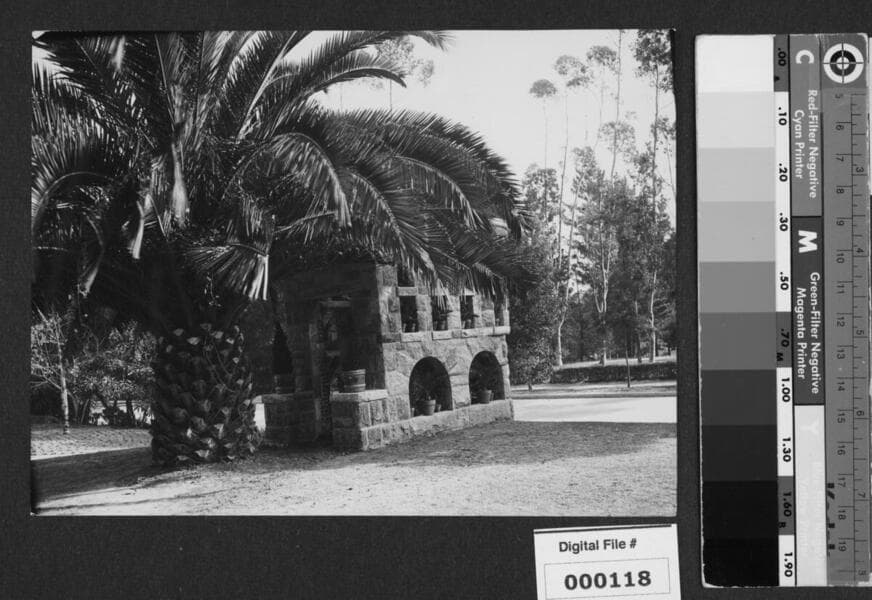Black and white contact print of the rear view of a replica of the Second Building, built at The Bivouac. Large palm tree visible to left of photo. Potted plants placed in niches of structure. Doorway to replica can be seen near center of photo, with two plants in ornamental planters; one on each side, both on raised, paved platforms. Street visible to right of photo, with curb and trees in background. Print is underexposed. Duplicate print of Image Number 000118. Related to Image Number 000131, 000132, 000133.
