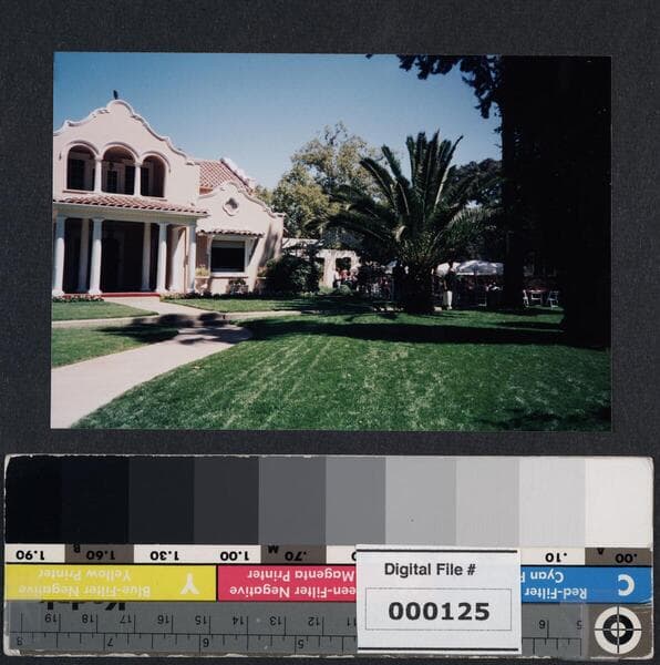 Color photograph of the side exterior view of the Schumb residence in San Jose, California. House resembles the architectural style of The Bivouac. House can be seen in background, with palm trees next to it in the front yard. Group of people walking around the yard visible near center of photo. Partial view of garden can be seen in foreground, with assorted roses and other plants. Written on back of photo is the address, "Schumb Residence. 1508 Newport Ave. San Jose, CA 95125. 1994." Related to Image Number 000124 and 000125.