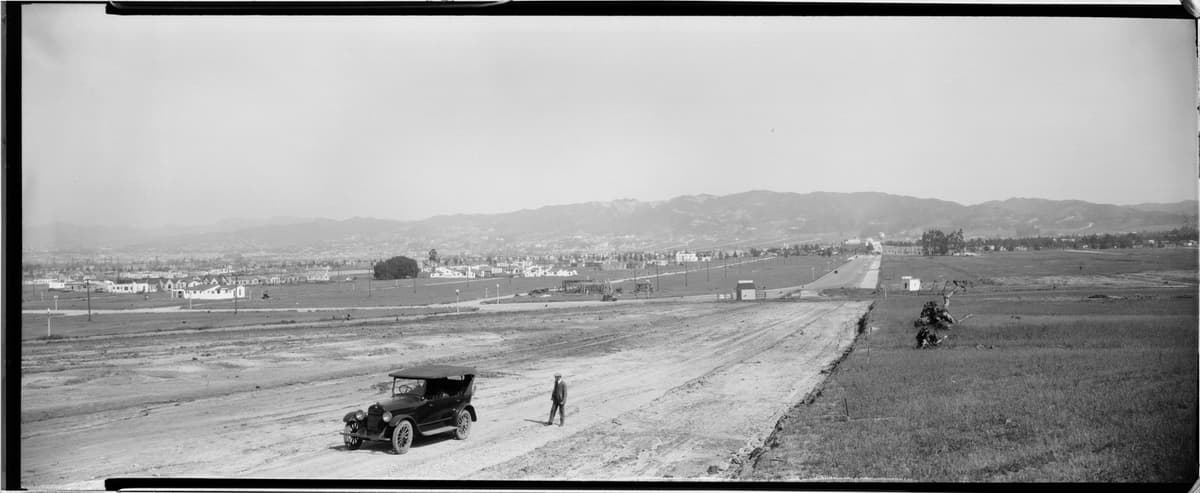 A panorama view of land of the Riviera development in Pacific Palisades in Los Angeles. The development was done by Frank Meline. The land in the foreground is mostly undeveloped with rough dirt paths. There are numerous houses in the background on the left.
