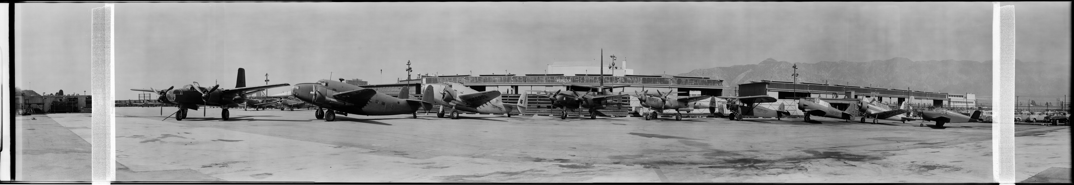 A panoramic view of the runway at United Airport in Burbank. The photograph was taken from the opposite side of the runway, facing the buildings and crowds. The white, Spanish-style terminal building is just left of center, with the Pacific Air Transport building to the left and two hangars to the right. There are numerous rows of airplanes parked on perpendicular runways on either side of the terminal building. The finding aid describes these airplanes as "military airplanes". There are hundreds of parked automobiles on the far right and left. Writing in white in the bottom, left of center, reads "No 4 Photo by ; F.M. Huddleston ; 4-26-1930".