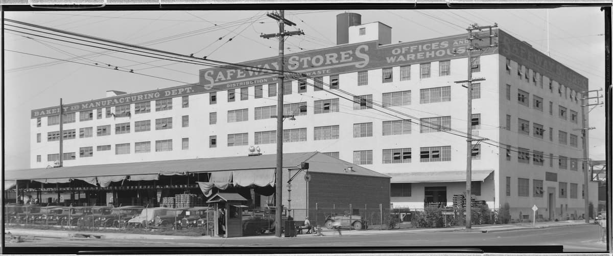Street view of business in the 900 block of Foothill Boulevard on the southeast corner of Foothill and Lake. The businesses include Dotten-Van Houten Co. (Real Estate & Insurance) and Safeway Stores. Automobiles are parked along the street.