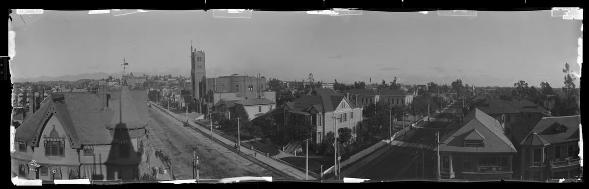A view of South Broadway from 2nd Avenue of the California Bank, the Y.M.C.A. and the Fort Street Methodist Episcopal Church.
