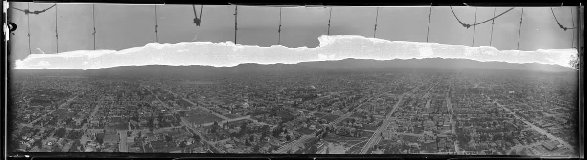A slightly elevated panoramic view of Los Angeles from 3rd and Hill. There are houses in the immediate foreground, then a large number of multistory buildings for offices and businesses. The steel frames of two tall buildings under construction are visible on the right. There are cable cars on the street in the middle of the image, as well as horse drawn carriages. A note written in white in the bottom left corner reads "Pierce 8008".