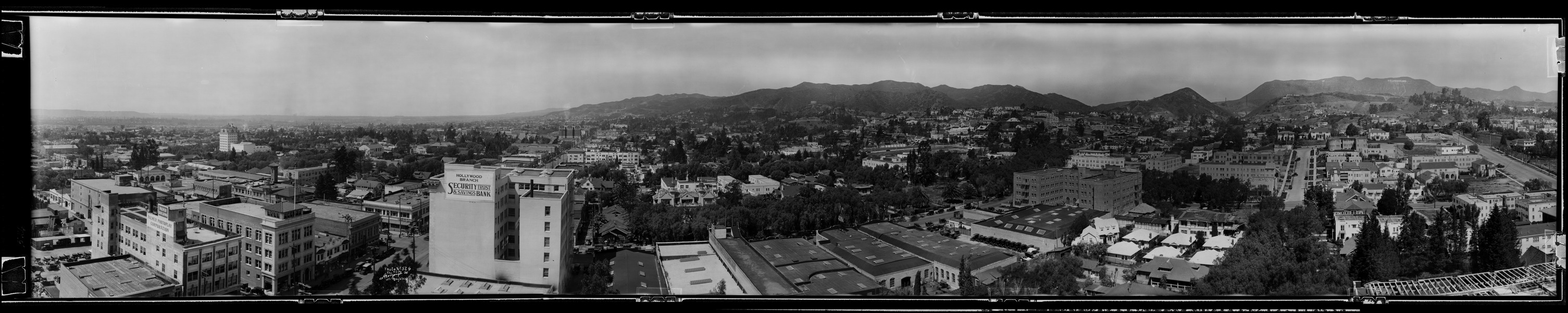 A slightly elevated panoramic view of Hollywood, Los Angeles, facing north. The foreground is mostly residential, with houses and apartment buildings, while farther away from the camera there are more business and office buildings. The "Hollywoodland" sign is visible on a mountain in the background. Other identifiable landmarks are the Hollywood YMCA and the Hotel Wilcox. A note written in white in the bottom left corner reads "Pierce 8015".