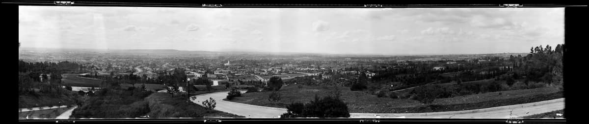 A panoramic view of a residential area of Westwood Village, in Westwood, Los Angeles. The area is built on rolling hills and has streets lined with street lamps. The houses in the foreground are somewhat widely spaced, but the houses on the hills on the left and in the center are more closely spaced. The areas between the houses have only low scrub growing. Writing in white on the right reads "Pettit's Studio ; 1416 W. Pico L.A. ; RI. 8534 ; Made 1933."