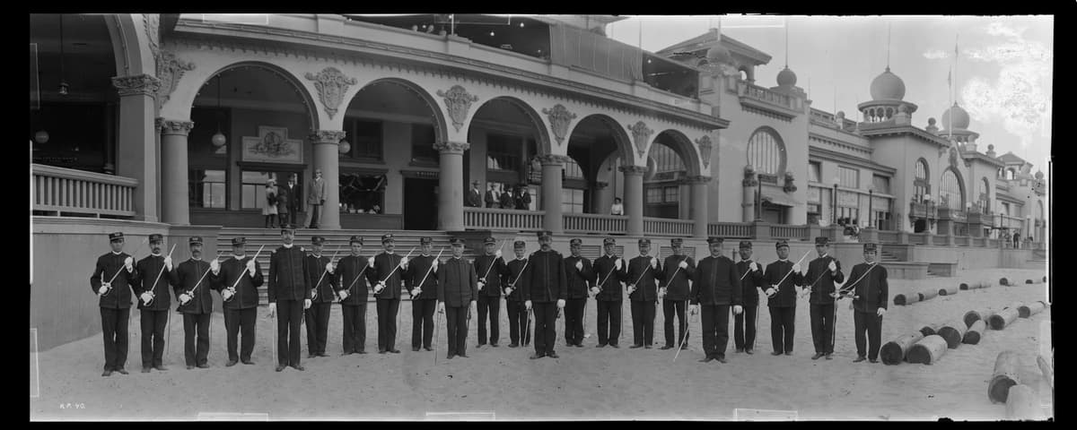A panoramic view of the Anaheim City Band and men belonging to the Knights of Pythias in Anaheim. The knights, dressed in military garb, stand in two long lines, with the musicians seated on the ground in front of them or standing alongside them in the back row. A group of 11 women are seated on chairs or a bench in the center of the front row.