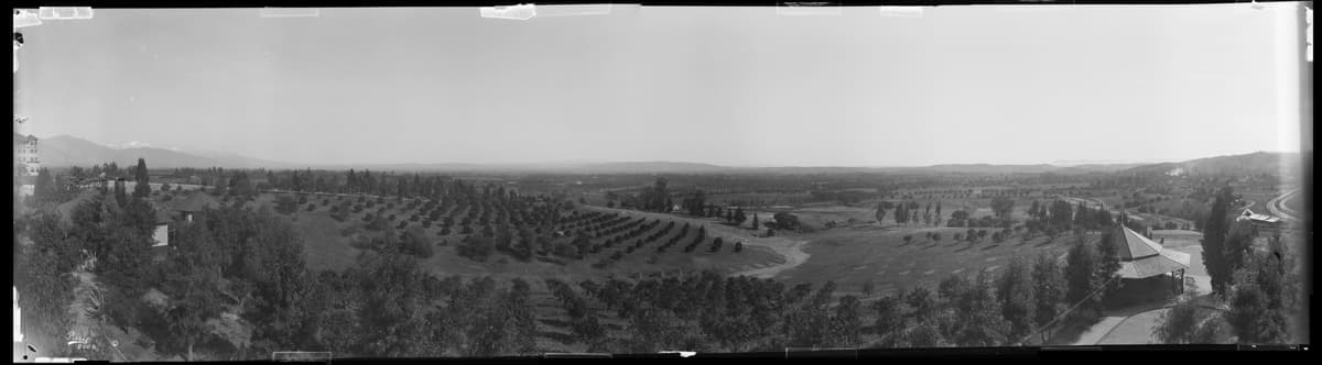 A slightly elevated panoramic view of the San Fernando Valley. There are a few buildings and orchards in the foreground, but most of the development is in the valley basin. Streets of houses are laid out on both sides of the hill in the center of the photograph, with the area on the left having more houses and trees than the area on the right. A note written in white in the bottom left corner reads "Pierce 8001".