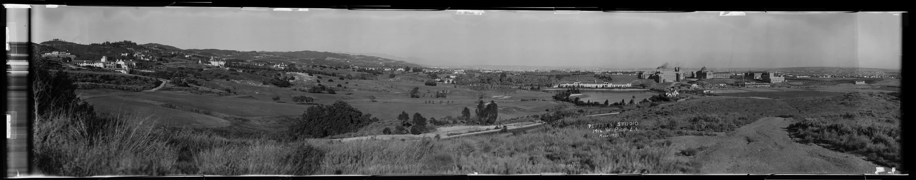 A panoramic view of the campus of the University of California, Los Angeles, and the adjacent Bel Air Tract. There are a few houses or apartments on the left, beyond which is the Bel Air Country Club golf course and a small lake. The UCLA campus is in the center of the image, with the Men's and Women's Gymnasiums at the bottom of the hill, in front of Royce Hall and College Library (now Powell Library). There are numerous automobiles parked in front of the gymnasiums. Westwood Village is visible on the far right. Writing in white above the road in the center reads "Photo by ; C.C. Pierce & Co. ; 1572 W Pico".