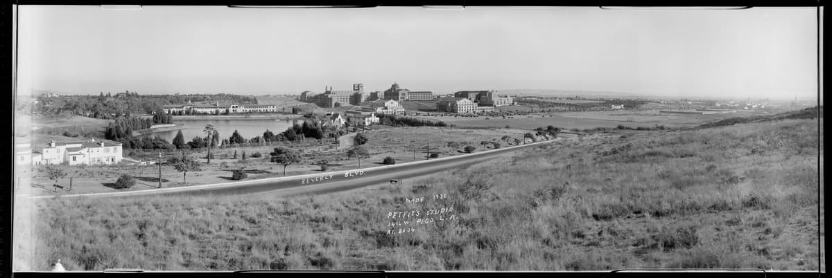 A panoramic view of the campus of the University of California, Los Angeles, and the adjacent Bel Air Tract. There are a few houses or apartments on the left, beyond which is the Bel Air Country Club golf course and a small lake. The UCLA campus is in the center of the image, with the Men's and Women's Gymnasiums at the bottom of the hill, in front of Royce Hall and College Library (now Powell Library). There are numerous automobiles parked in front of the gymnasiums. Westwood Village is visible on the far right. Writing in white above the road in the center reads "Photo by ; C.C. Pierce & Co. ; 1572 W Pico".