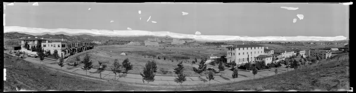 A panoramic view of the Monterey section, west of the University of California, Los Angeles, campus. The view faces east, across a street lined with young trees, towards the multistory fraternity houses. There are a few automobiles parked along the street. The campus buildings visible beyond the fraternity houses include the College Library (now Powell Library) and Royce Hall. PhotCL 470 (126) is a similar view taken from slightly farther north.