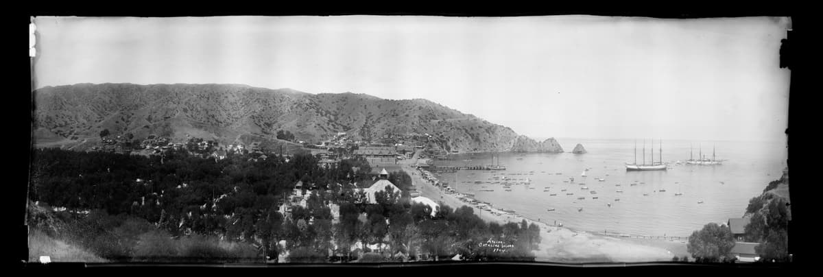 A panoramic view of the harbor at Avalon, on Santa Catalina Island. The photograph was taken from somewhere along the northwestern shore of the bay, with the city of Avalon on the far right. There is a boat with a striped canopy and seven or eight people on it being rowed across the center of the image. There are also a few people standing or sitting on the shore. There are several unoccupied small boats on the water, as well as a three mast sailing ship, and few sailboats with their sails up. Writing in white at the bottom reads "Avalon Bay, Catalina. ; 1904."