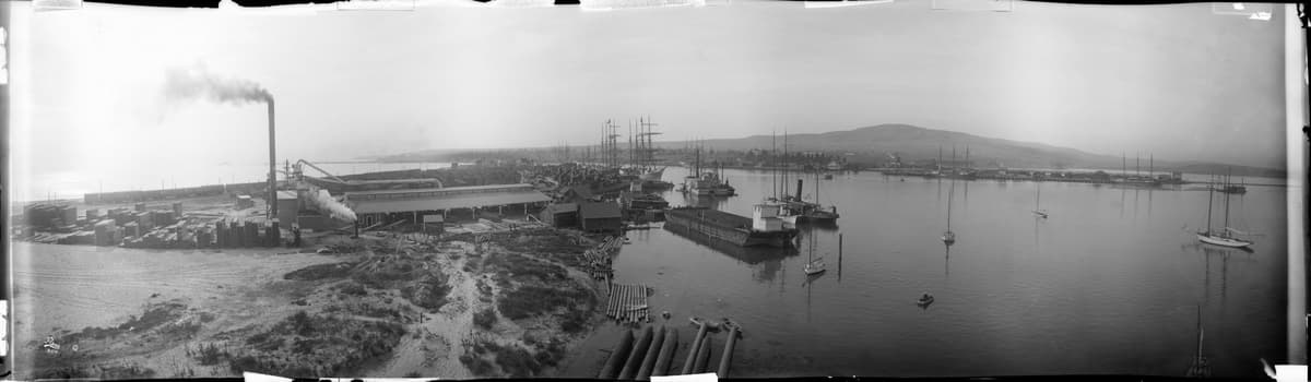 [Pierce 05662 -05667 forms a panorama]. View of docks with sailing ships.
