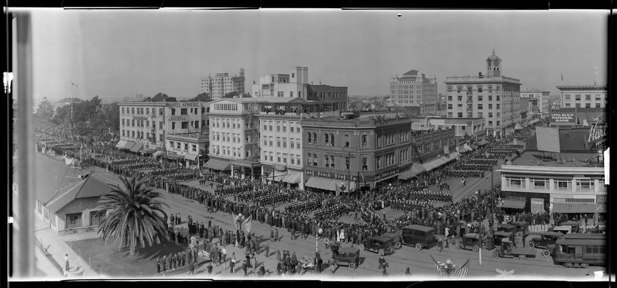 A panoramic view of the 1922 Armistice Day Parade in Long Beach. Service men in uniform are marching in formation on Ocean Avenue, past Lord & Taylor, Hotel Schuyler, and Hotel Kinnebac, after having turned right off of Pine. The lines of men marching down Ocean are marines, and those on Pine are sailors. Both Ocean and Pine are lined with spectators, and vehicles, including a street car, are backed up at the corner. Spectators are also watching from the windows and roofs of buildings along the parade route.
