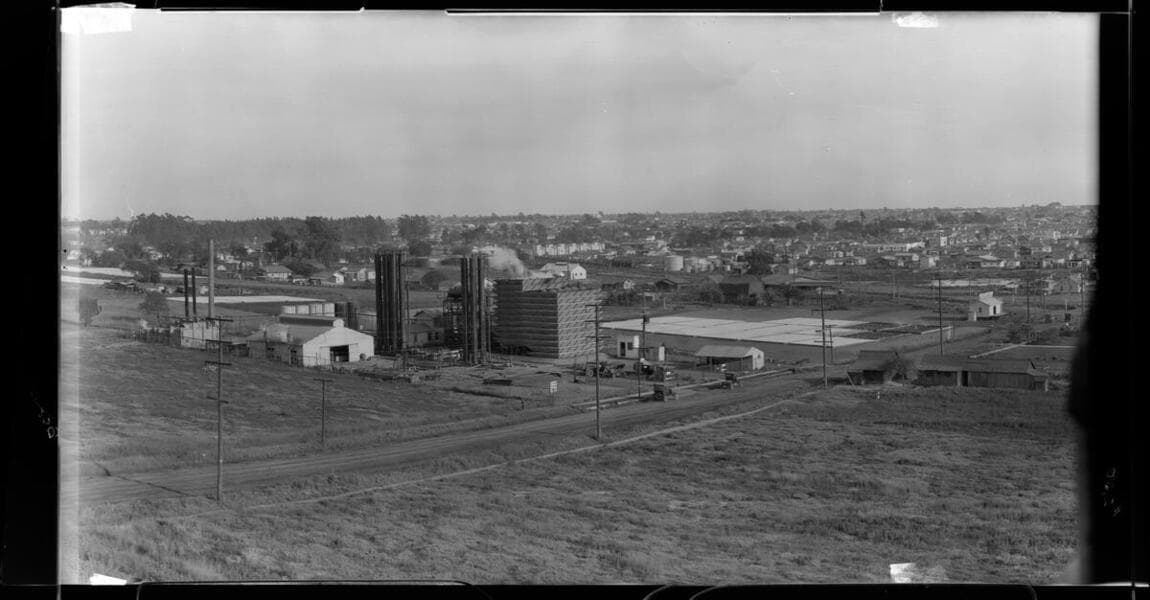 A panoramic view of an oil refinery in Signal Hill or Long Beach. There are several low, circular structures left of center, and to the right small rectangular buildings. Several automobiles are parked on the far right near what looks like a garage. Railroad tracks on the left end before they reach the circular structures, and there is a small building under construction next to the tracks. Most of the land is undeveloped fields, and besides one oil rig, or derrick, on the right, beyond the water tower, there are no other signs of the oil industry. Writing in white in the bottom right corner reads "Photo No. 271 ; The Aerograph Co. ; 5880 Moneta ; L.A. - Calif."