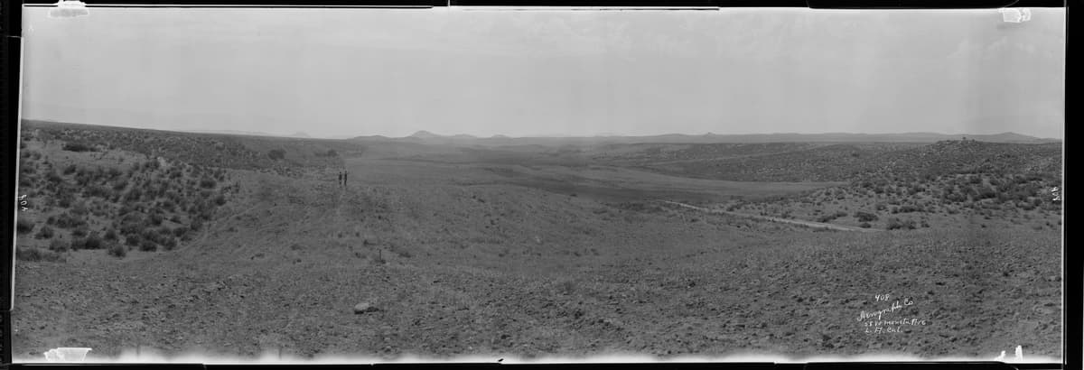 A panoramic view of an area near Corona. Two men in suits stand in an open field that seems to have been plowed, facing the mountains in the distance. There is a road on the left which runs through the low rolling hills. Writing in white in lower right corner reads "#504 ; Aerograph Co ; 5880 Moneta Ave ; Los Angeles, Cal."