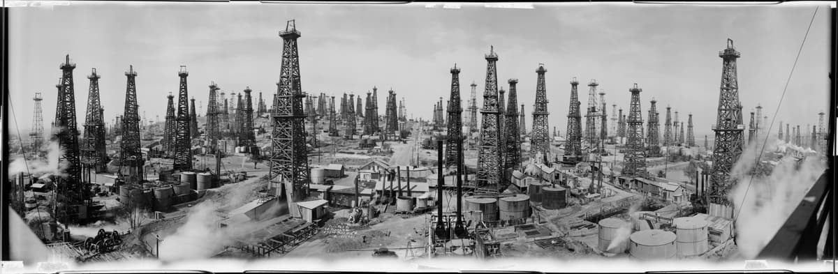 A panoramic view of the oil field of Signal Hill. There are about twenty oil rigs, or derricks, spread across the image, with many more visible in the distance on the far left. There is a man walking along the unpaved road just left of center, while a woman watches over two children in a field from the house on the left. There are several widely spaced houses across the landscape, as well as sheds at the base of each derrick.